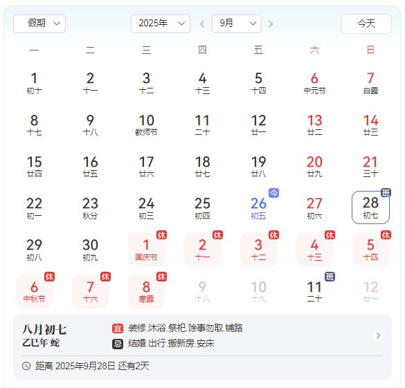 10月1日(星期三)至10月8日(星期三)放假8天,9月28日(周日)、10月11日(周六)為國慶調(diào)休正常上班,調(diào)整期間給你帶來不便敬請諒解,派臣科技祝您度過一個平安、祥和的節(jié)日假期!